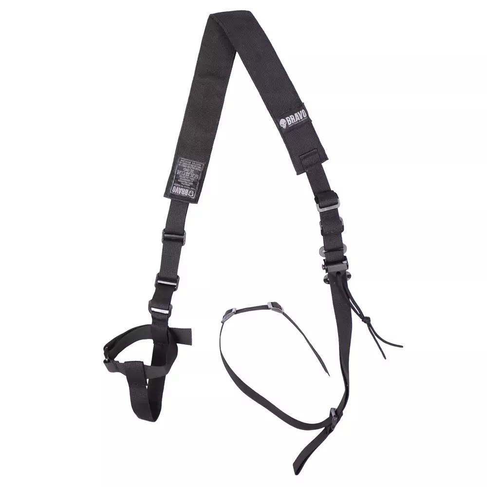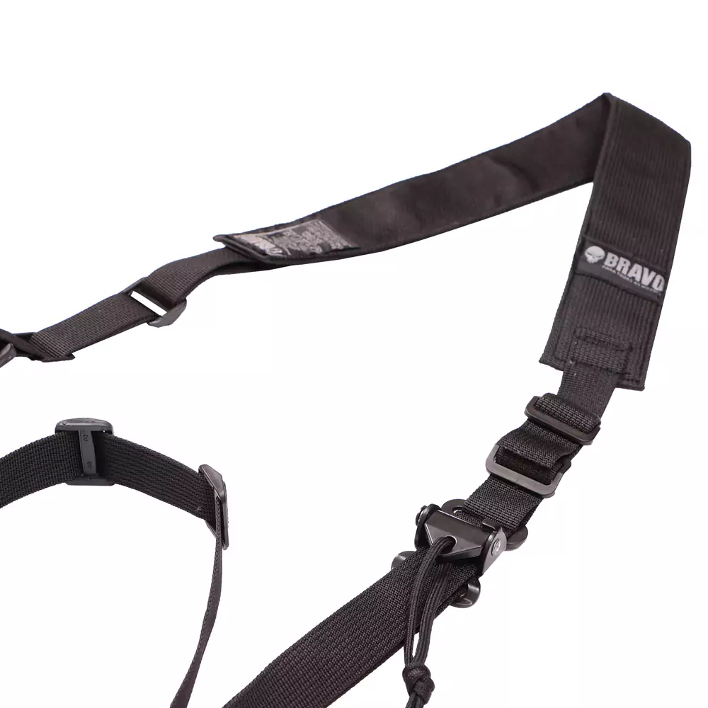 Bandoleira Assault da Bravo Militar, possui duas pontas com sistema de regulagem rápida para compressão, permitindo estabilizar a arma ao corpo para transporte ou uso das mãos.