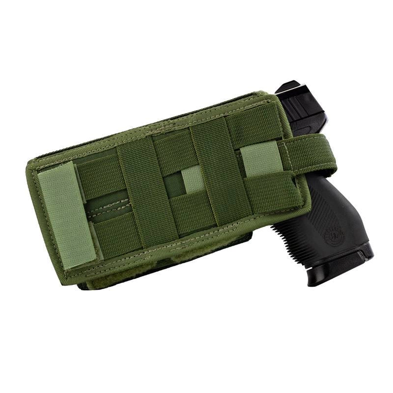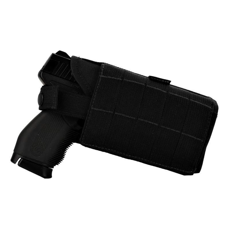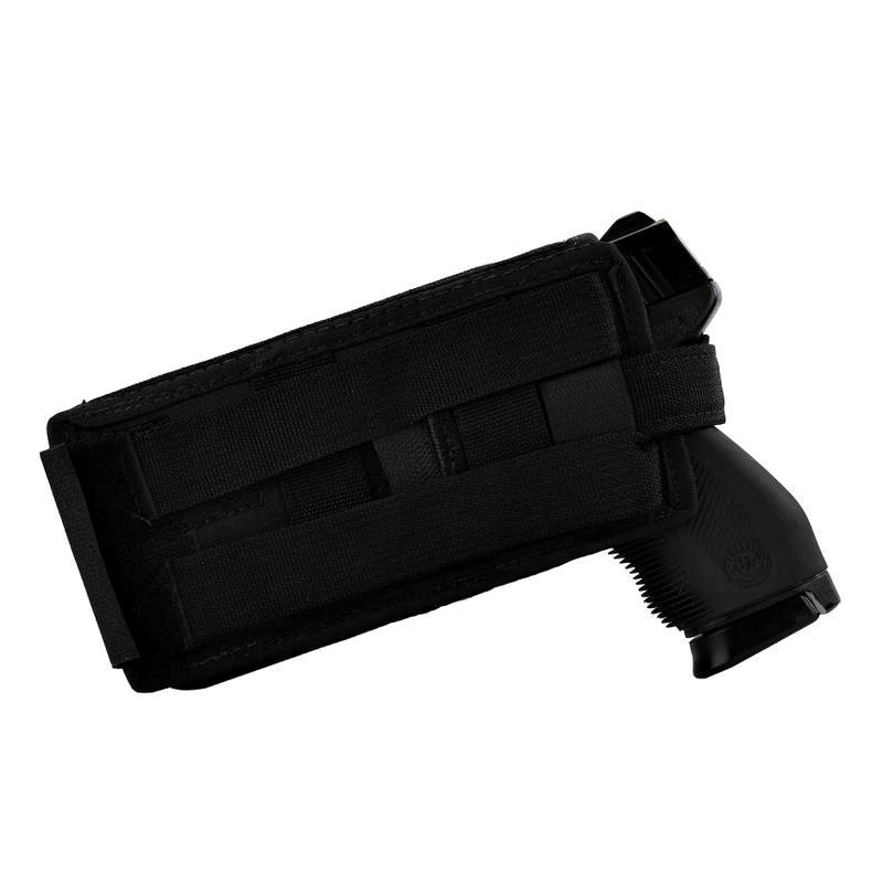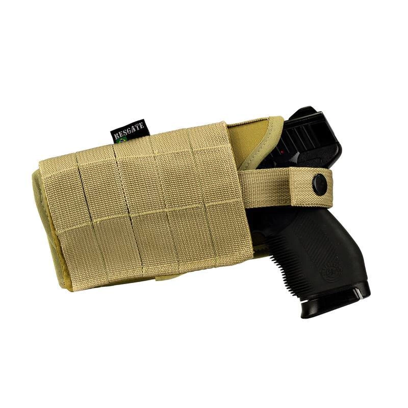 Confeccionada em Rip Stop com duas camadas de resina, E.V.A e fitas de poliamida proporcionando uma alta qualidade e resistência. Possui sistema de regulagem para cinto tático e colete modular. Fechamento em botão. Compatível com qualquer modelo de pistola sem o uso da lanterna, podendo ser regulado na sua lateral e altura através de um sistema com fecho de contato.