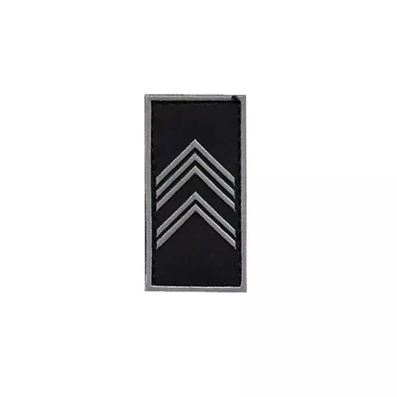 - Divisa emborrachada confeccionada pelo processo de moldagem quente, na cor cinza, sobre um suporte na cor preta, sendo aplicada por meio de velcro na cor preta;