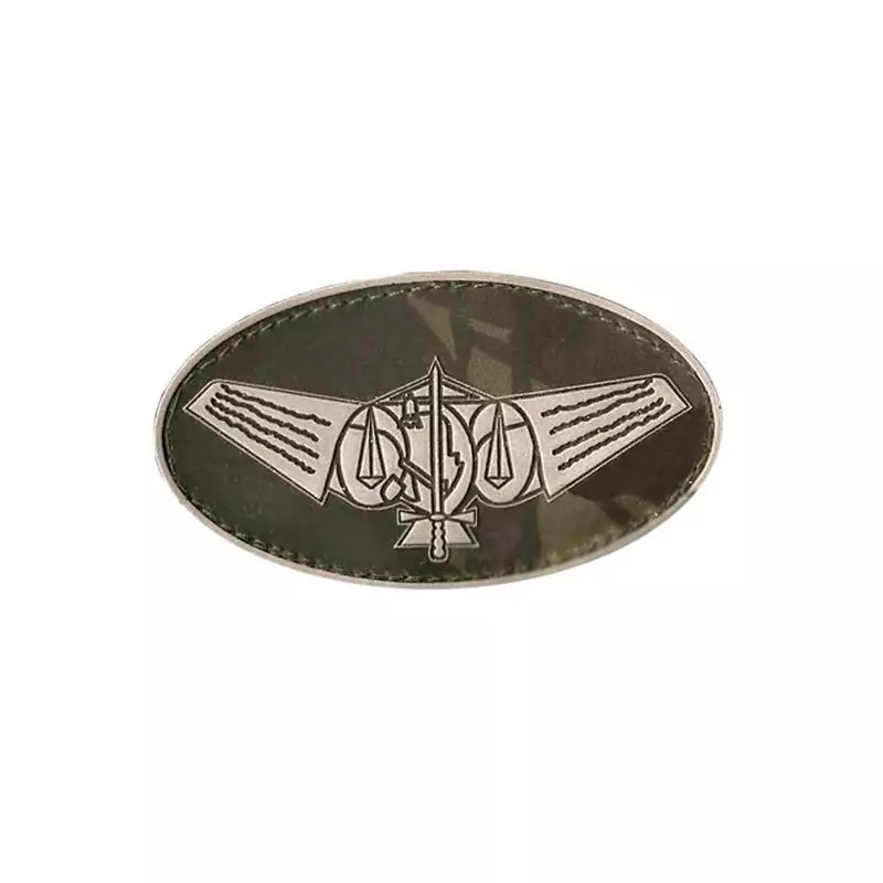 - Brevê emborrachado confeccionado pelo processo de moldagem a quente, na cor cinza, sobre um suporte na cor camuflada, sendo aplicado por meio de velcro na cor verde oliva;